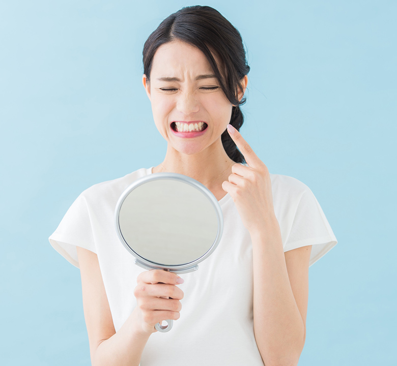 むし歯に多いのが「隙間むし歯」です。特徴は自覚症状があまりないこと。歯ブラシだけでは十分に届かない歯間部でむし歯菌が繁殖し、気づかないうちに進行していきます。鏡で見てもわからないことが多く、穴を舌で感じることもできません。進行していくと歯の表面が欠けてきて初めて気づくことができます。