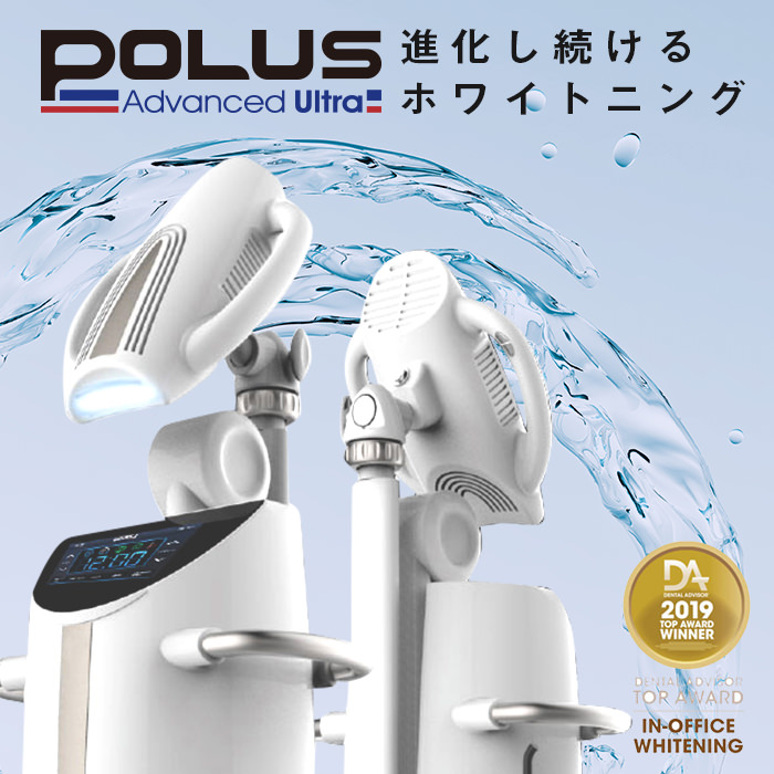 歯科医院で行うホワイトニングです。医療機関のみに使用が許されている高濃度の薬剤を歯に塗り、一定時間特殊な光を当てることでその場で歯を白くする方法です。当院では「POLUS Advanced Ultra」という機器を使用しております。ホワイトニング機器として唯一「ハロゲン光」という特殊な光を使用することで、より安全に、より効果的に歯を白くすることが可能になりました。